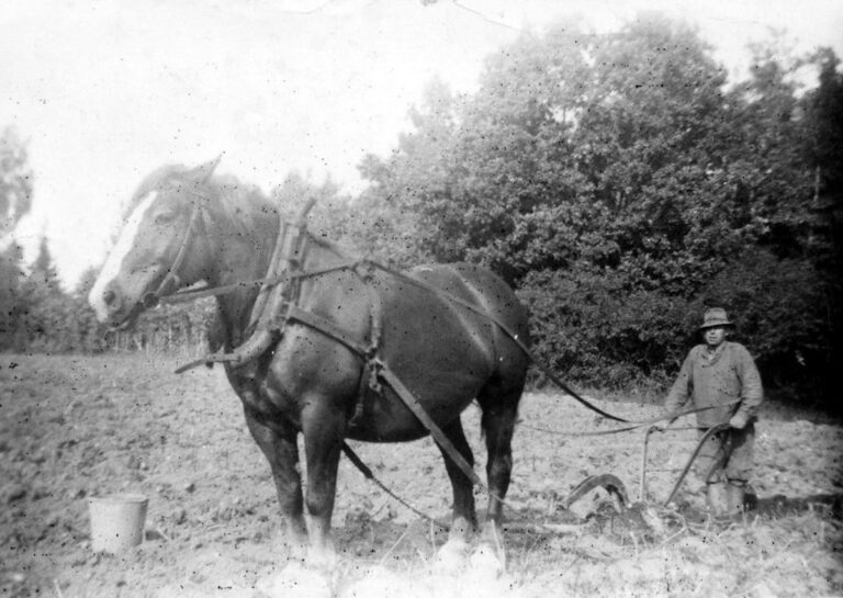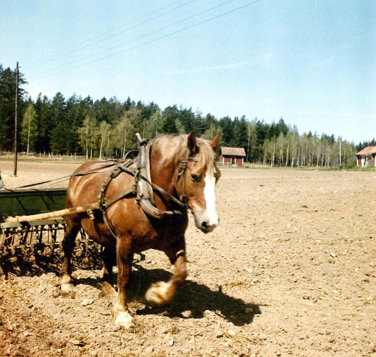 Vårsådd med hästen Docka. Stavsborg i bakgrunden
