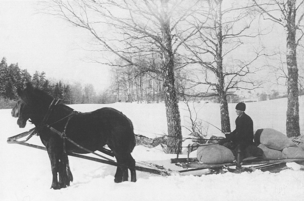 Henning Andersson vid Tomta vägskäl, på väg till kvarnen i Skorpa. 1930-talet