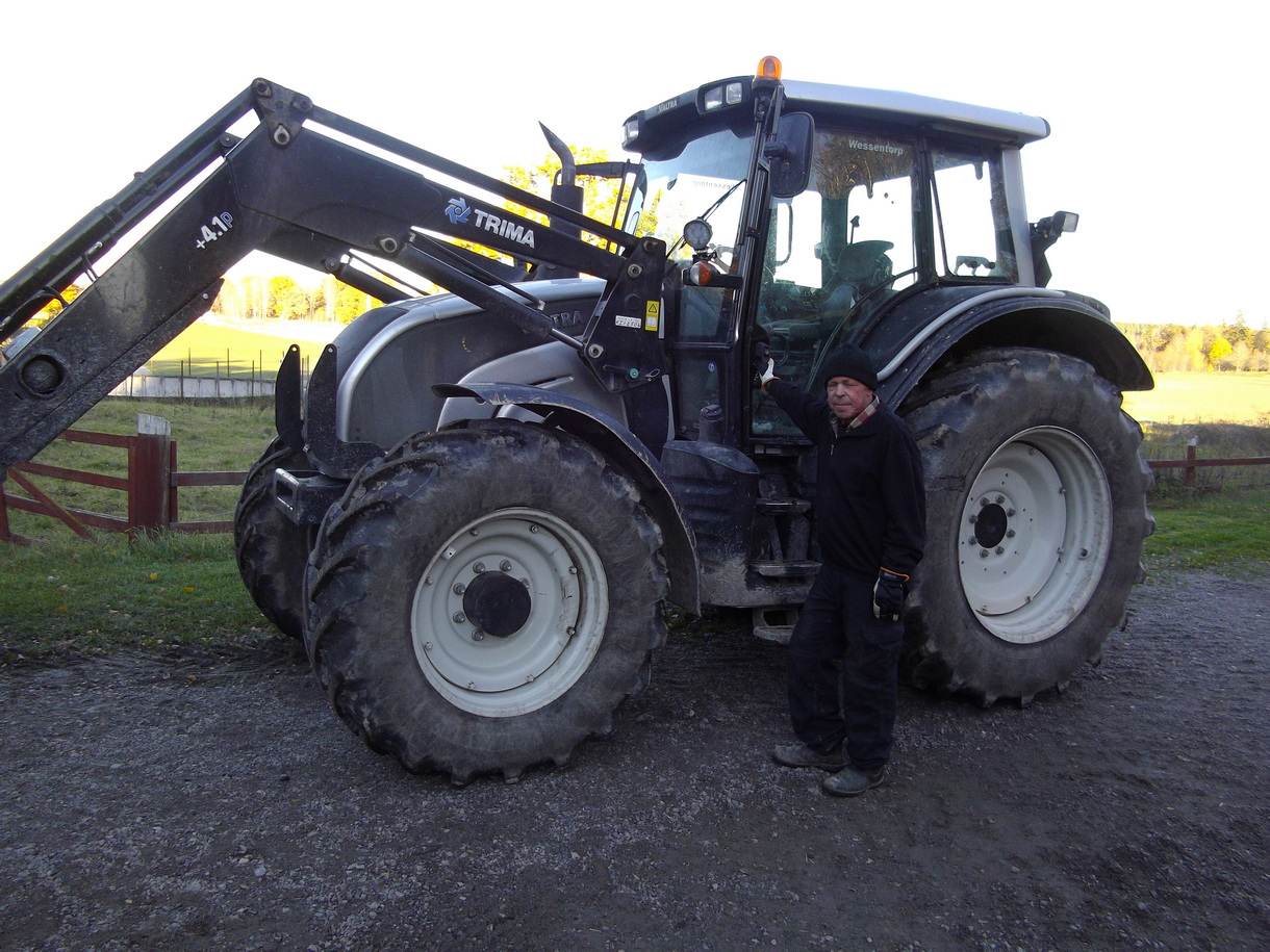 Anders Ekdahl vid sin största moderna traktor, en finsk Valtra. 2016-10-30. Foto: Lars Jonsson