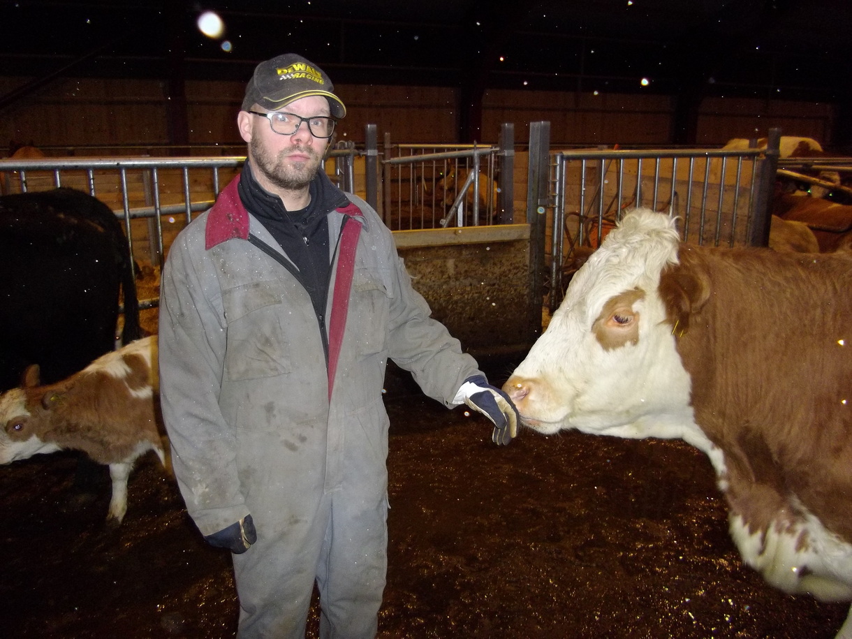 Lars-Johan Jonsson med en av sina kor i den nya lagården. 2017-01-03 Foto: Lars Jonsson