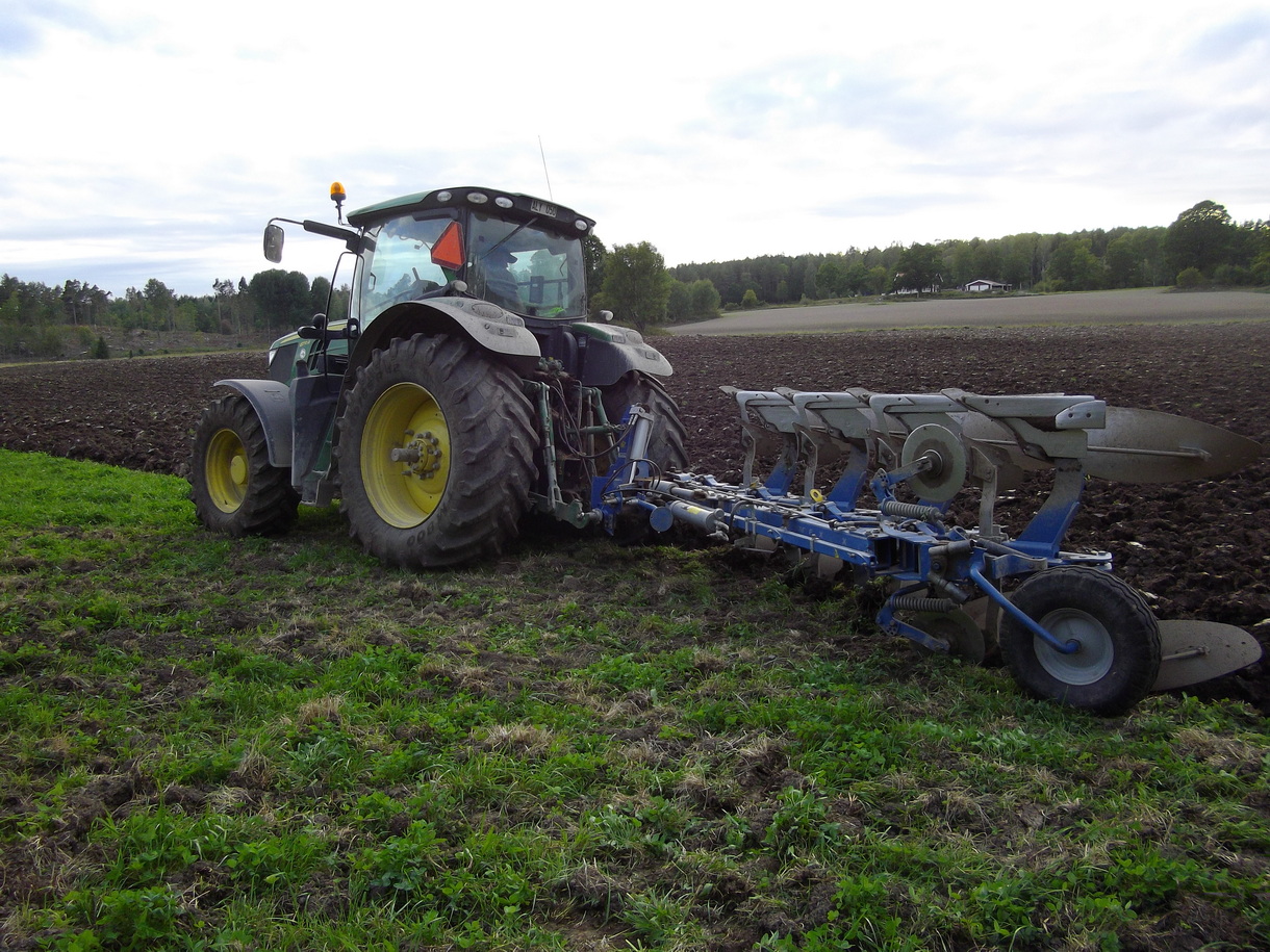 Här plöjer Lars-Johans anställde (Stefan? ) med den fyrskäriga växelplogen 2016-09-02. Foto: Lars Jonsson