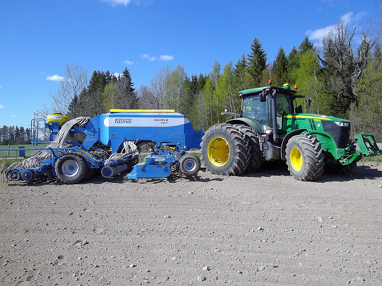 Traktor med såmaskin 2017-05-12. Maskinen bearbetar, gödslar och sår samtidigt Foto: Lars Jonsson
