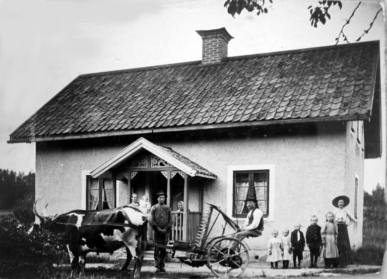 Oxdragen slåttermaskin. ca 1910 i Bäck. Kvinnan med schalett på verandan är Victors farmor. Victors mamma (Adina) med Lilly i famnen. Framför verandan morbror Oskar. På slåttermaskinen drängen Kalle från Melskog.