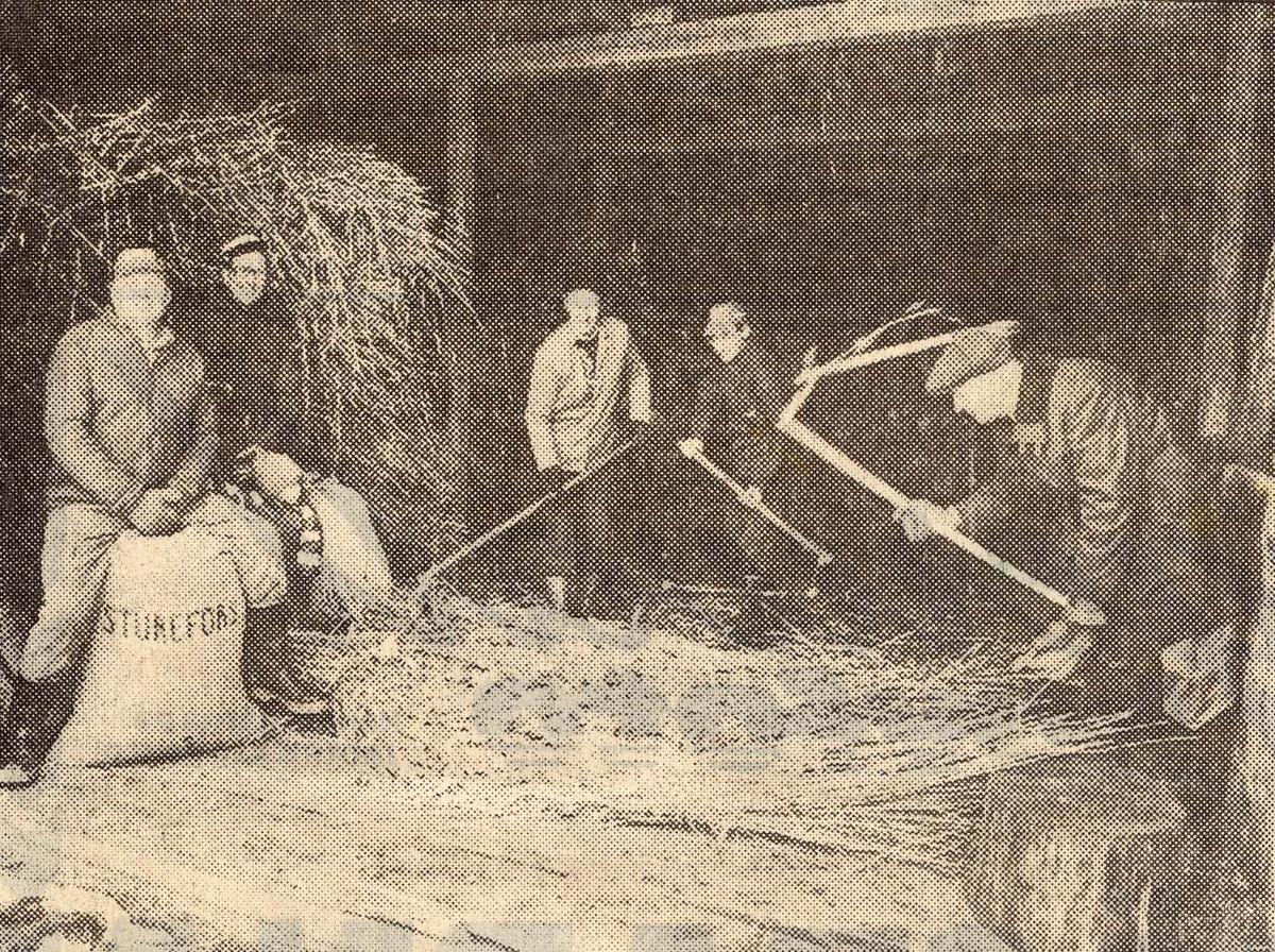 Markustorpspärmen Djur och natur sid 139. Tröskning i Dalshult. Sven-Erik Johansson, Ingmar Carlsson, Göran Johansson och Erik Nilsson.
