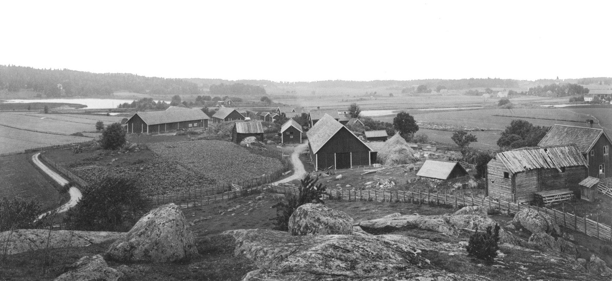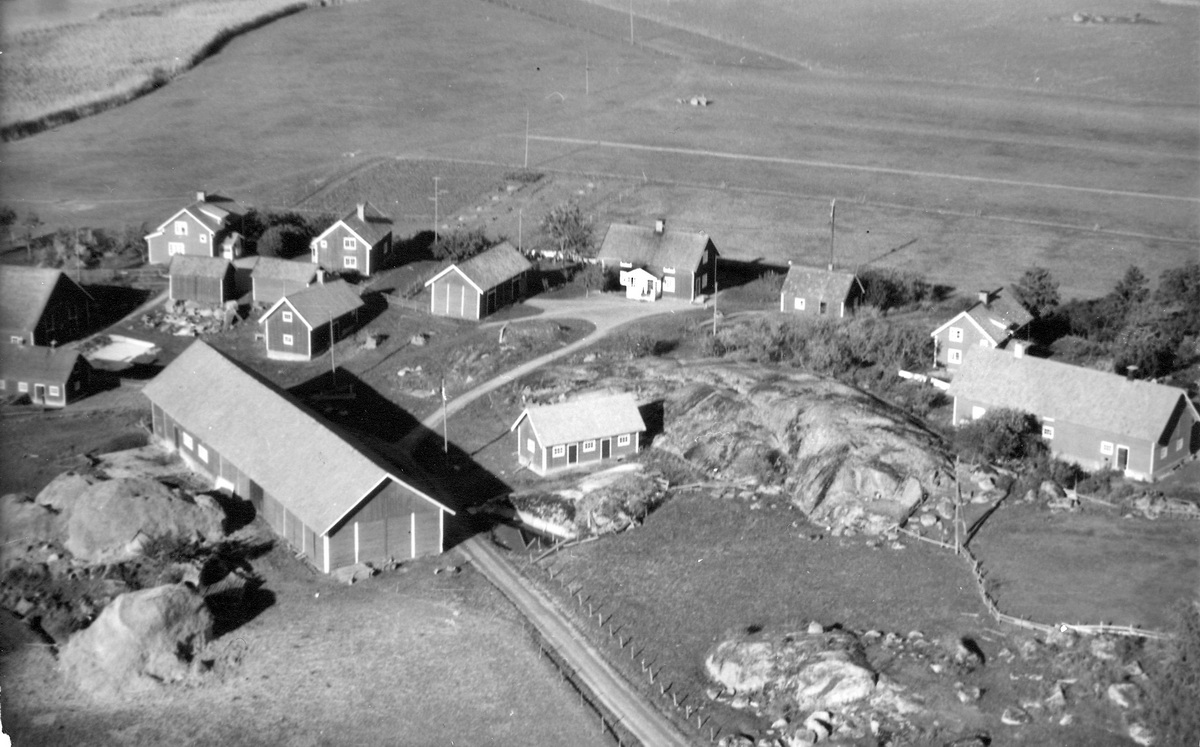Från vänster ses Tomtberget, Överby, Stengården, Storgården (två bostadshus) och Nergården.