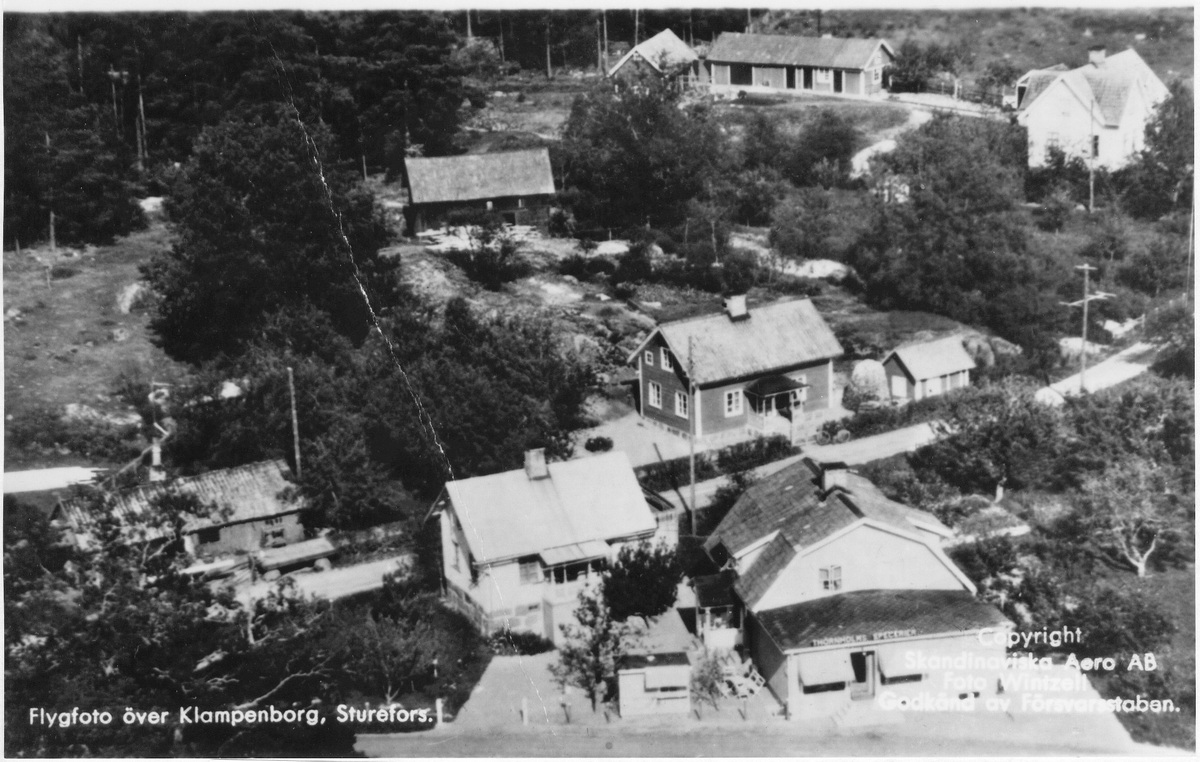 Den förste som drev egentlig lanthandel vid Klampenborg hette Karlsson. Därefter kom en som hette Johansson omkring 1909. Han hade bara en hand. Handelsboden stod på ofri grund med ett årligt kontrakt. När kontraktet skulle löpa ut var det svårt att hitta en efterträdare. Under en kort tid hade Knut Jonsson (porslinshandlarn) filial där. Näste handlare hade varit mjölnare vid Sturefors kvarn och hett Sandkvist. Antagligen friköpte han tomten omkring 1912. Efter honom kom en skomakare, O Pettersson, som ägde affären 1918 till 1928. De sista två, tre åren drev Axel Lind rörelsen.